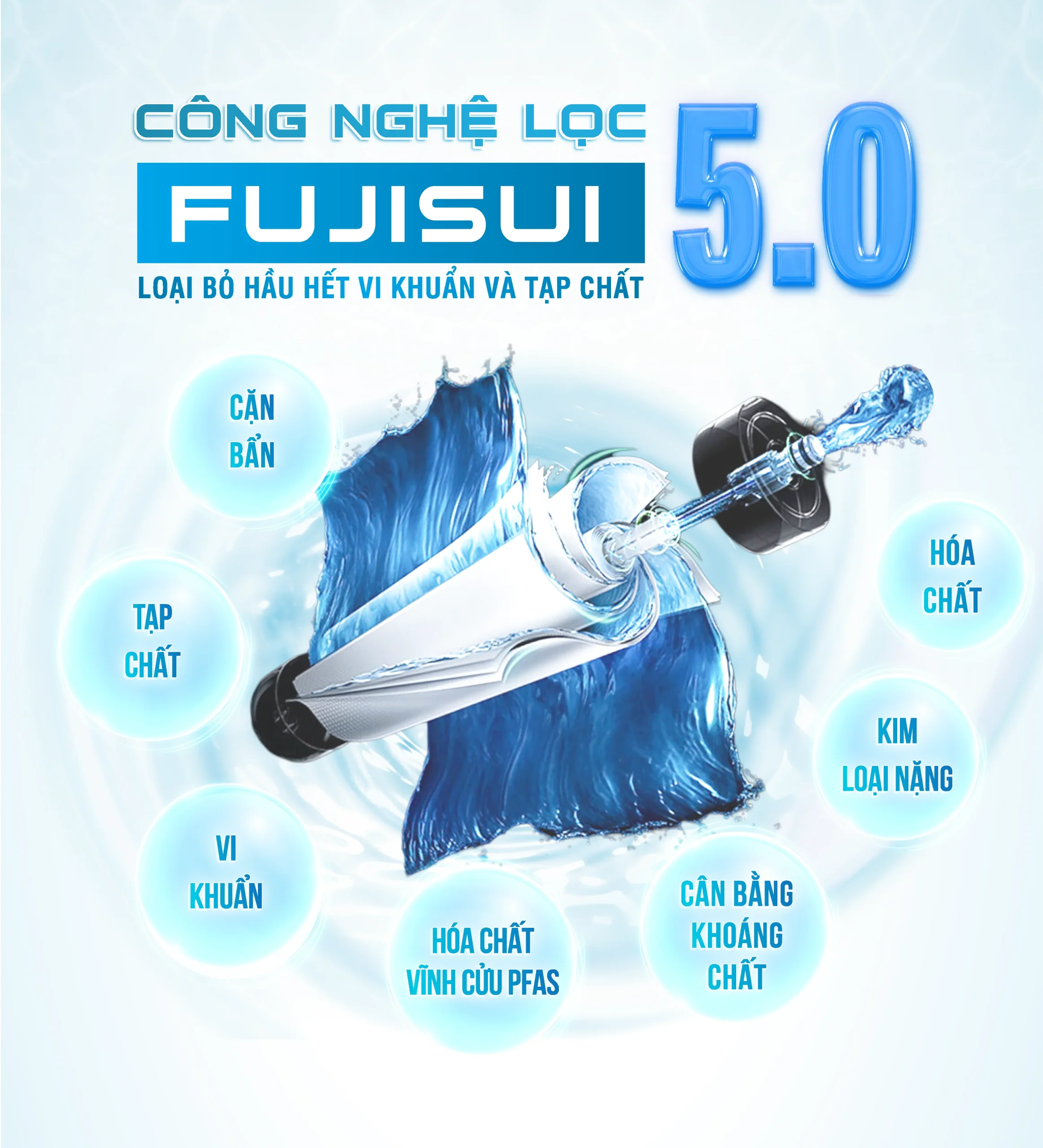 Nước máy hiện nay không chỉ chứa cặn bẩn hay vi khuẩn mà còn tiềm ẩn các tạp chất nguy hại như kim loại nặng, hóa chất độc hại và PFAS, những chất ảnh hưởng xấu đến sức khỏe lâu dài. Công nghệ Fujisui 5.0 được thiết kế để xử lý toàn diện các vấn đề này, mang đến nước sạch, an toàn để sử dụng hàng ngày.