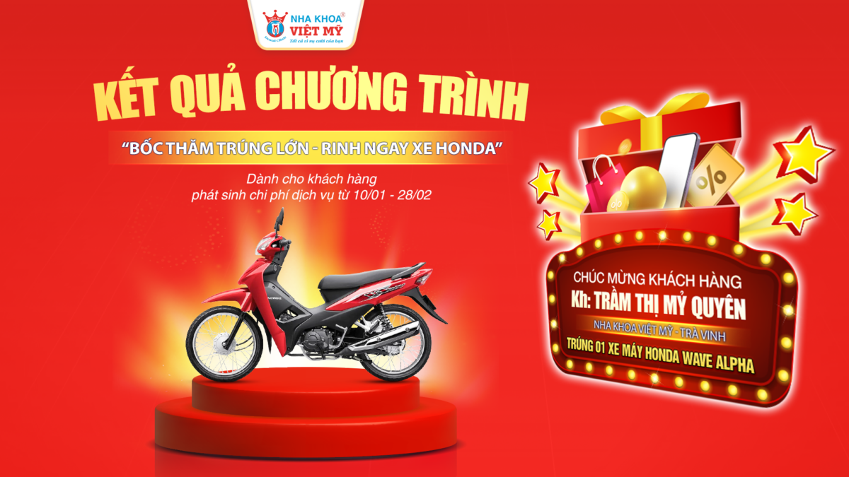 Chương trình “Bốc thăm trúng lớn – Rinh xe máy Honda” do hệ thống Nha khoa Việt Mỹ tổ chức đã tìm được chủ nhân may mắn của giải thưởng đặc biệt: 01 chiếc xe Honda Wave Alpha trị giá đến 20 triệu đồng.